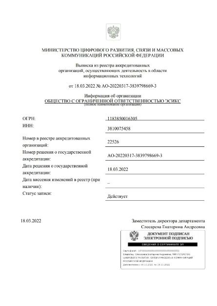 ООО "ЭсИкс" является организацией, осуществляющей свою деятельность в области информационных технологий. Компания прошла государственную аккредитацию Министерства цифрового развития, связи и массовых коммуникаций Российской Федерации (Минцифры России). Внесена в реестр аккредитованных организаций,осуществляющих свою деятельность в области информационных технологий.